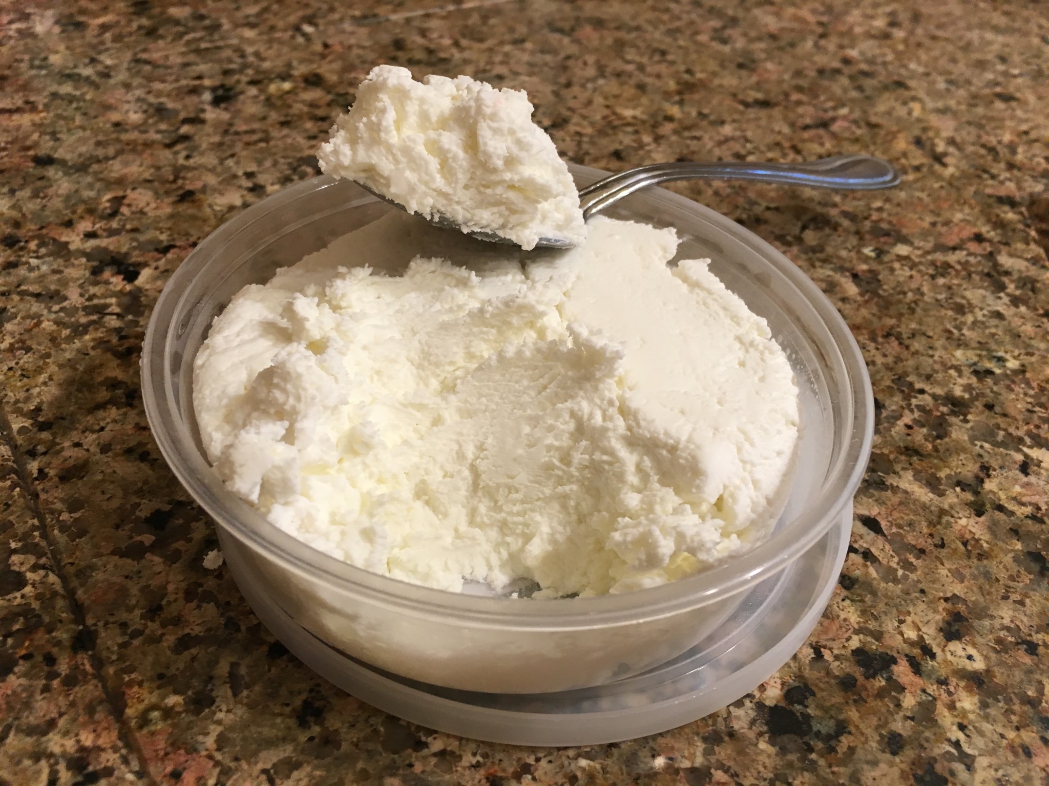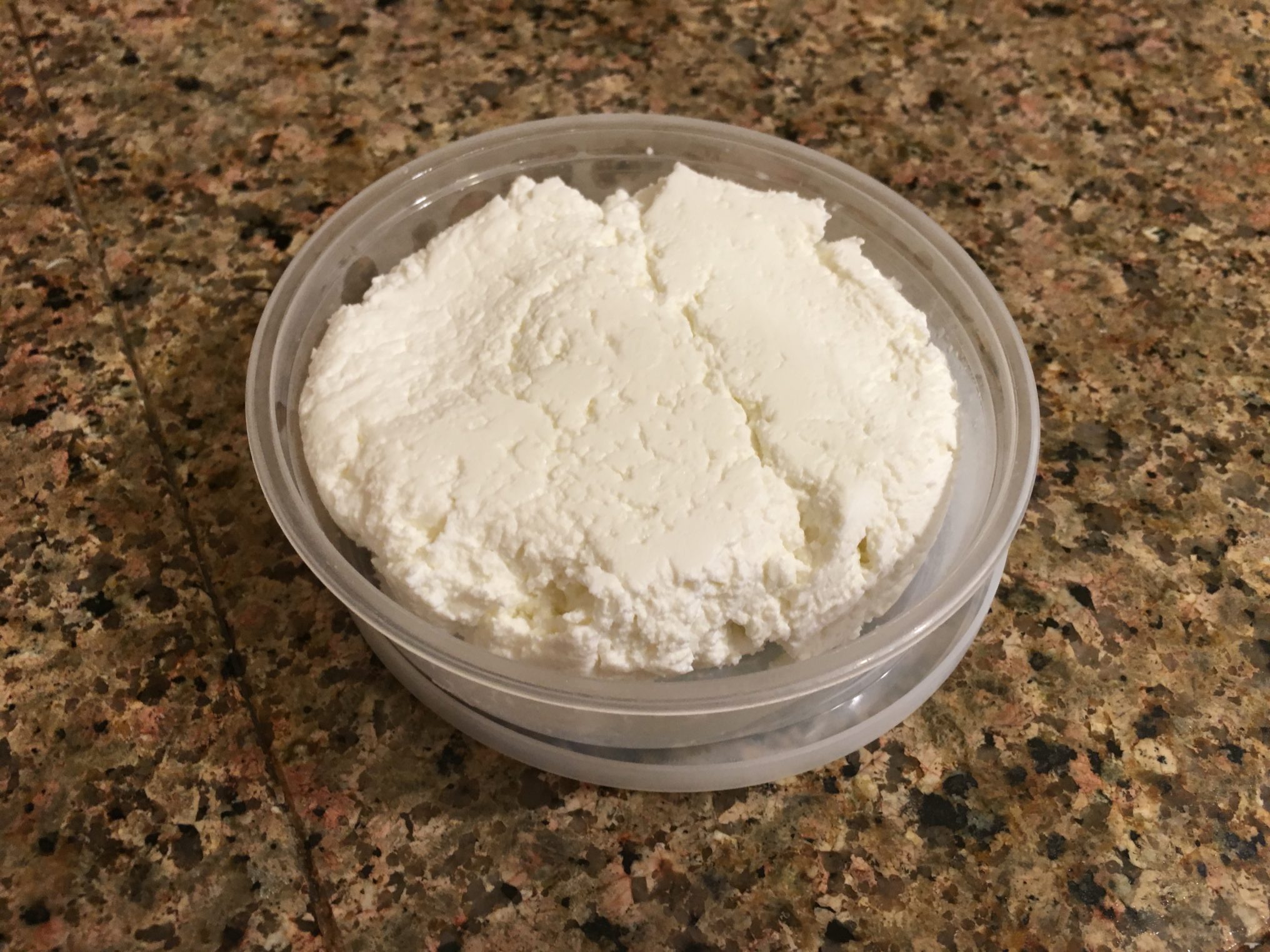 The contents of the round container are a typical goat cheese. As you can see, it is both sticky and sort of flaky. I would say paste-like, but that can sound unappetizing to some. To me, that is good, but I digress. Soft and semi-sticky, as goat cheese usually is, this Chevre Frais crumbles with some effort and settles into your mouth with ease. The flaky, smooth quality of its body makes it wonderful to crumble over salads and other dishes.