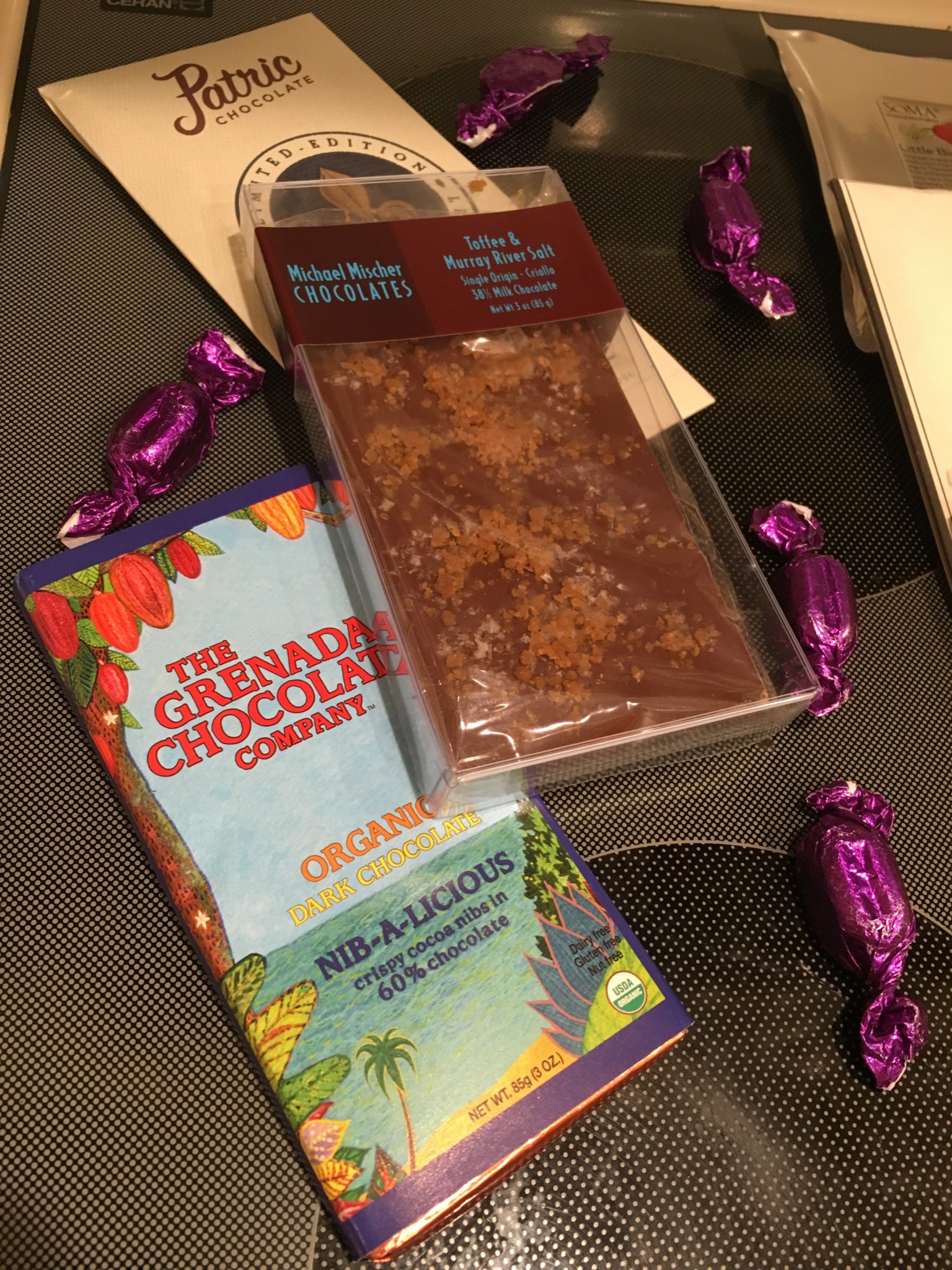The Chocolate Garage is a San Francisco based company that sells chocolate. They do not make the chocolate they sell, rather they stock a variety of brands and sources. One of the things they sell is a chocolate tasting box that has a collection of around eight or nine different bars. They have two different tasting box types: The Purist and The Playful.